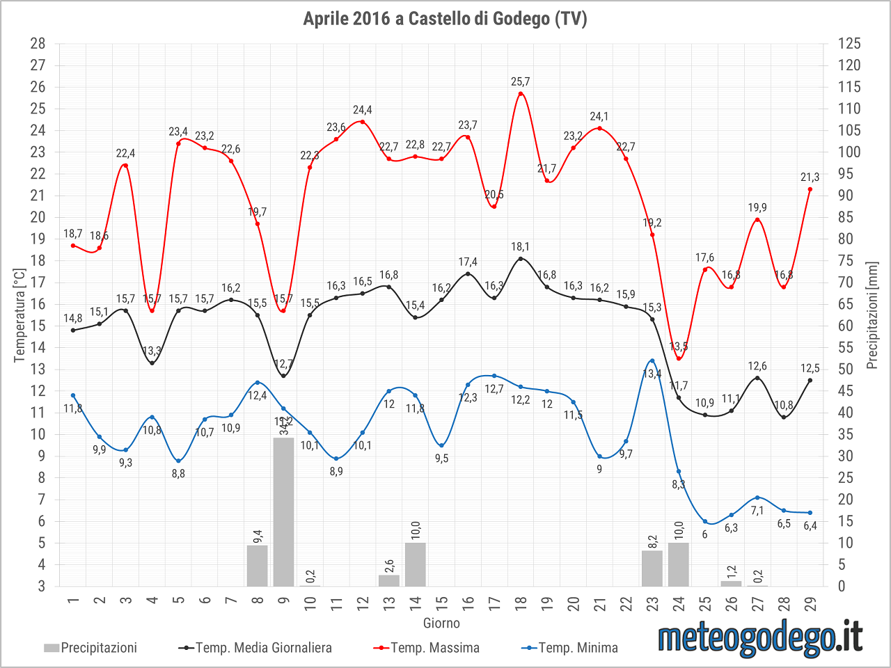 Un temporale ha sfiorato Godego nel tardo pomeriggio di martedì, facendo cadere 3 mm di pioggia. Nel frattempo, ho aggiornato la sezione Dati e Statistiche del sito con il riepilogo di Aprile 2016. Un mese caratterizzato dalle temperature sopra media, eccezion fatta per l’irruzione fresca degli ultimi giorni. |